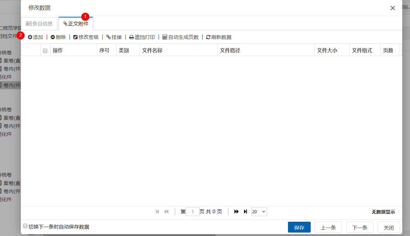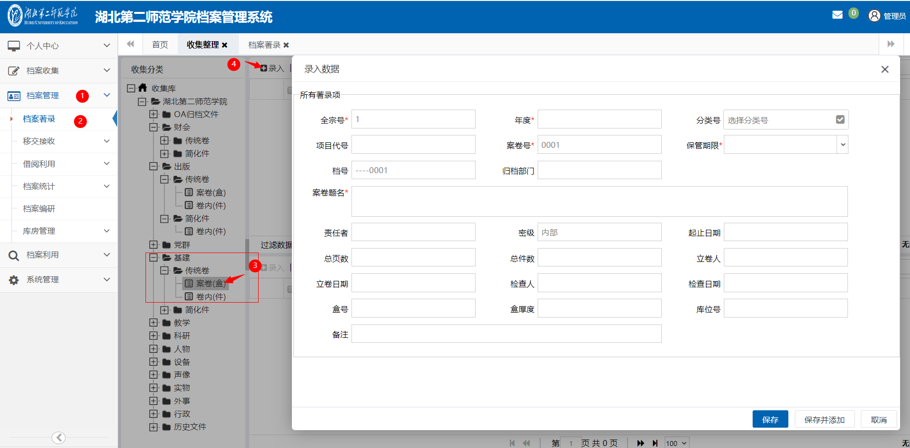 基建档案等传统案卷结构的档案需要先录入案卷(盒)数据,然后点击案卷级别数据,在下方页面再录入卷内(件)数据。