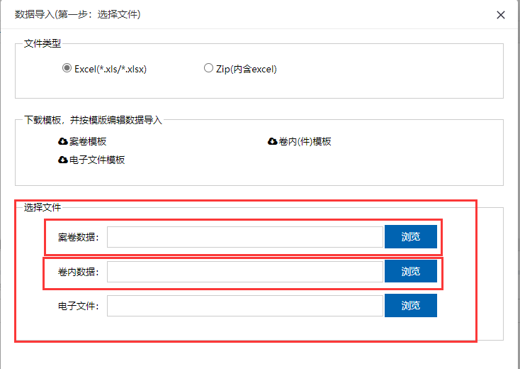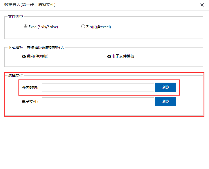 案卷方式需要同时案卷数据和卷内数据两栏点击浏览找到对应表格后点击下一步;