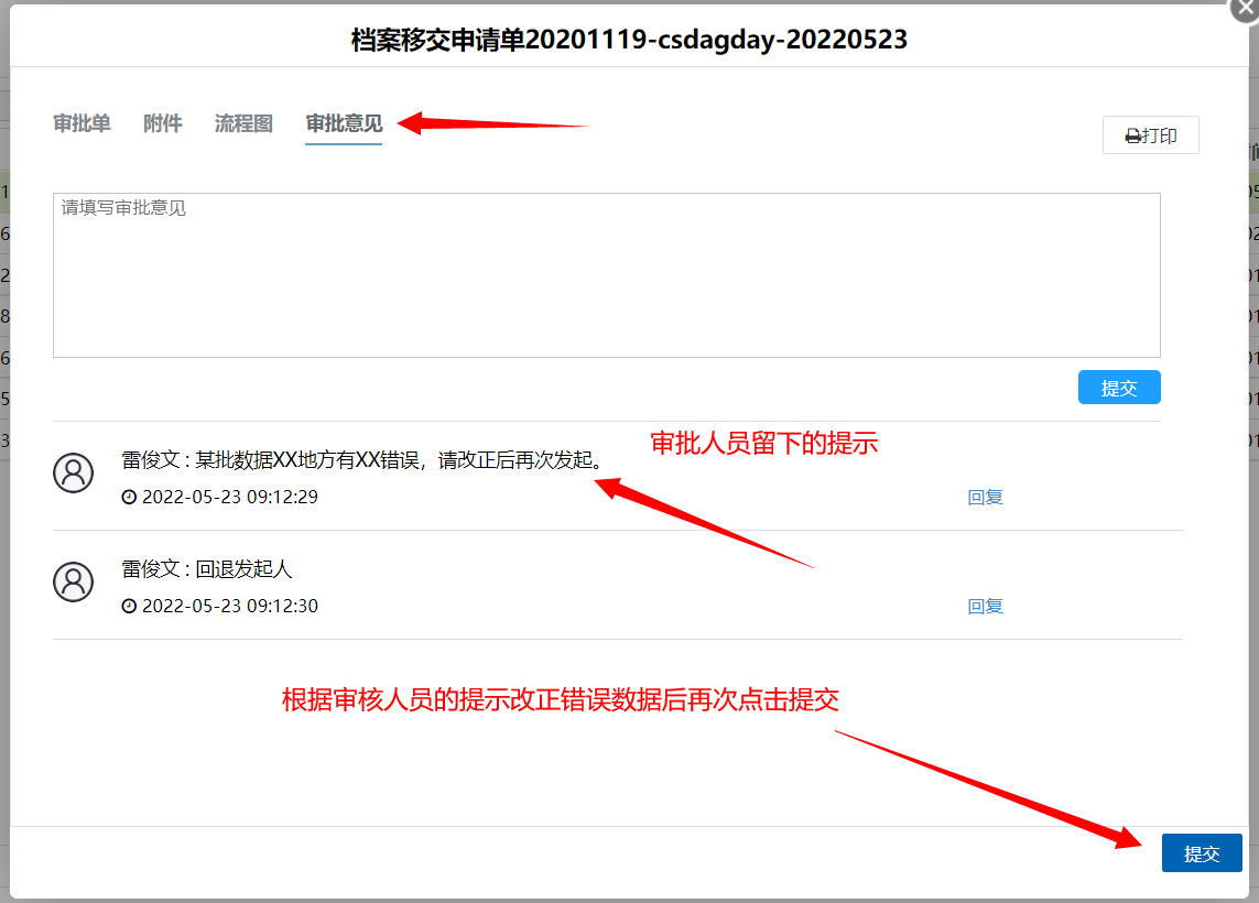 档案移交如未通过,可在个人中心—协调管理中—待办中查看申请单信息,在审批意见中查看审核人员留下的未通过原因,对数据改正后再次发起移交