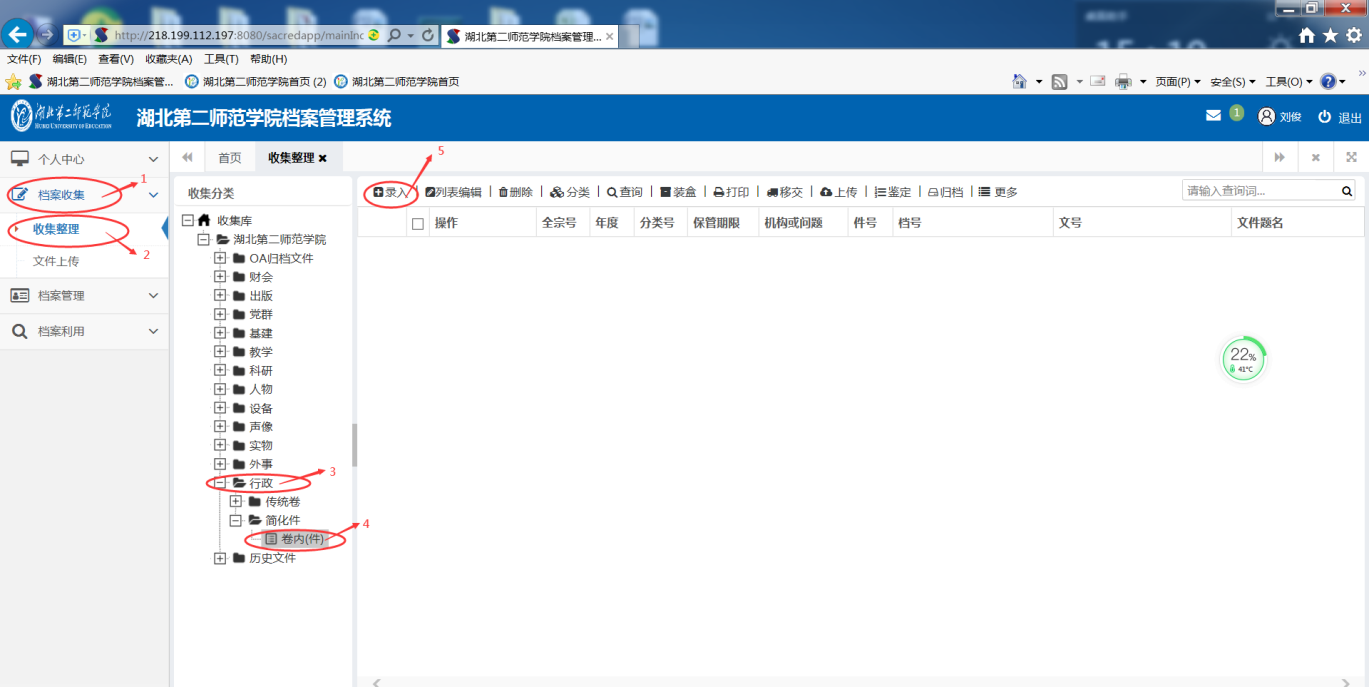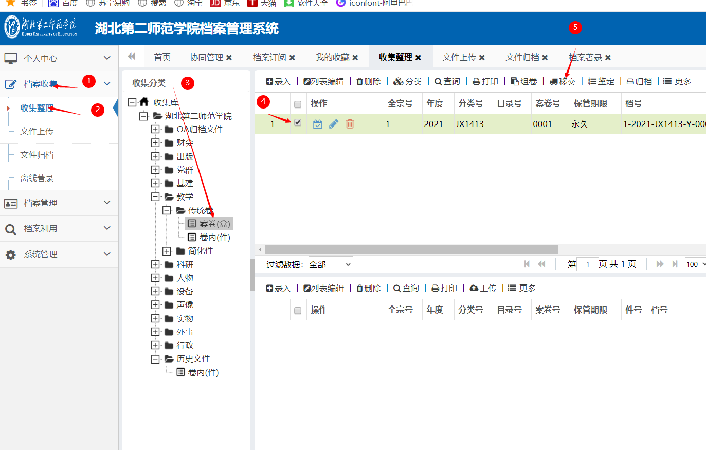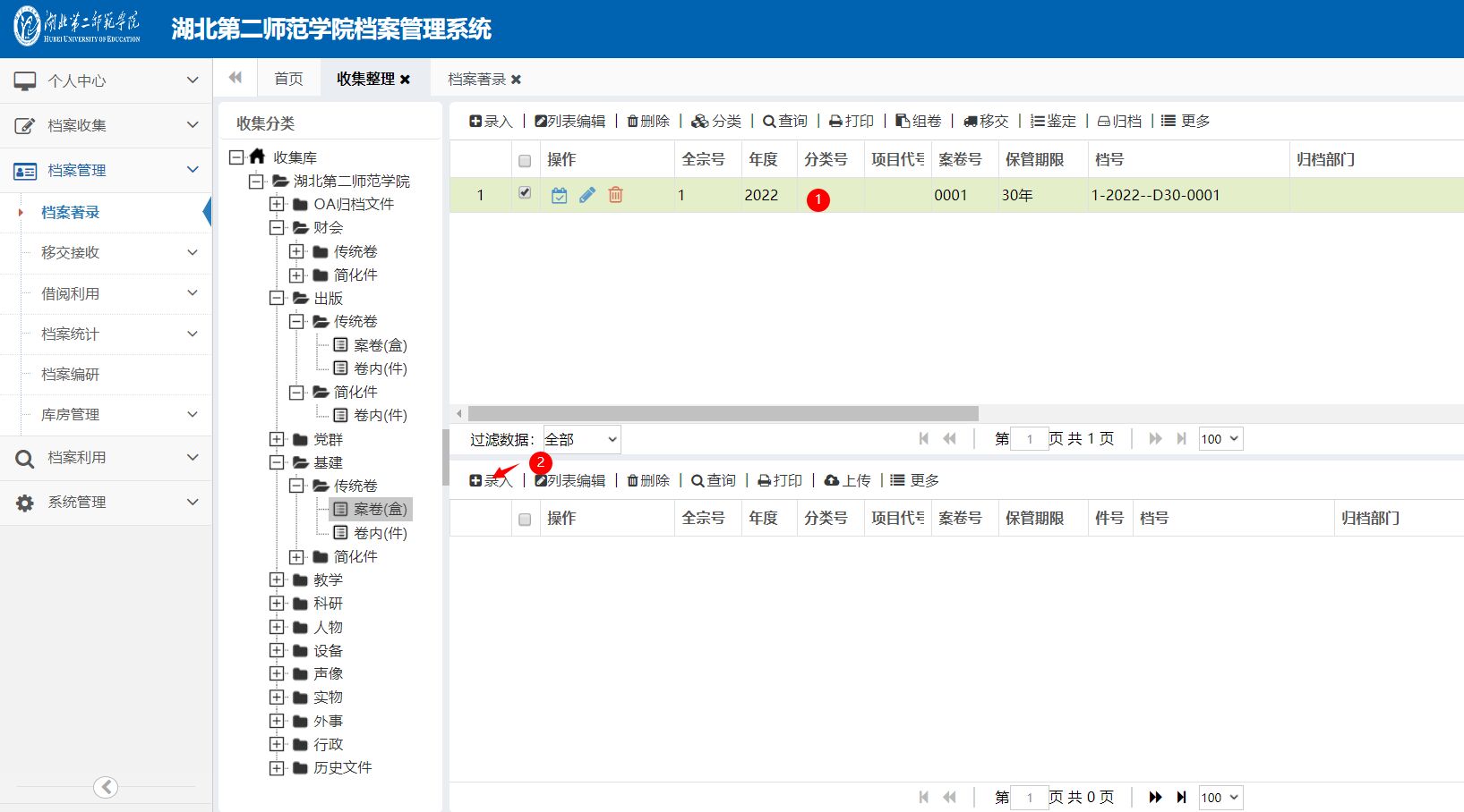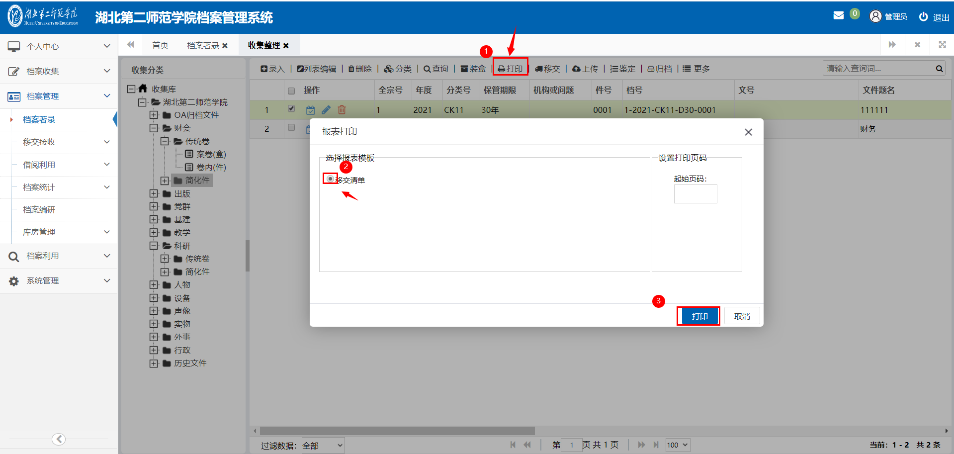 3.录入、上传完毕后,在档案管理系统内申请审核(档案馆对应在线审核人员名单详见附件3),档案馆审核通过后,从系统导出、打印《湖北第二师范学院档案移交清单》,(一式两份、签字盖章),在规定时间内与归档材料一并移交档案馆,档案馆在接收纸质档案的同时接收电子数据。