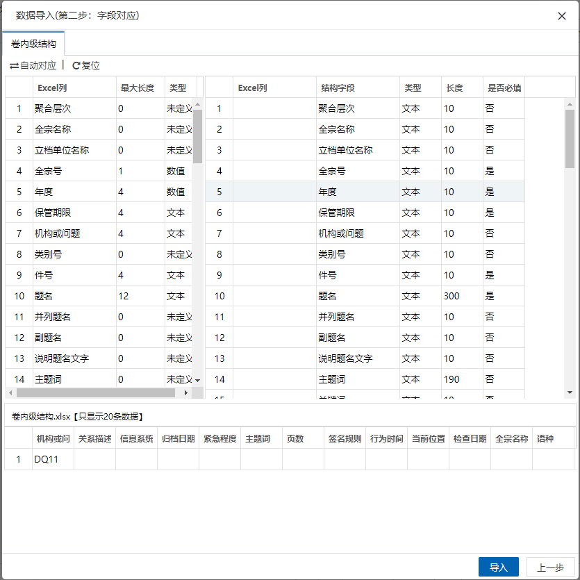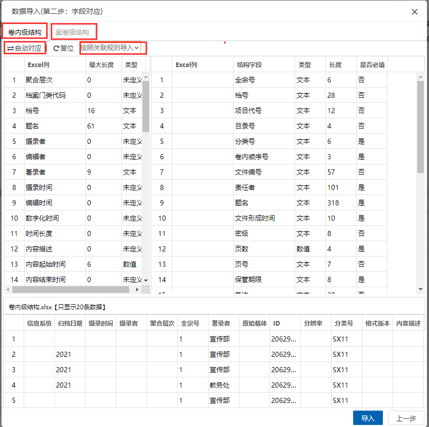 分别点击数据导入页面上方卷内级结构标签和案卷级结构标签的“自动对应”功能按钮将excel字段列与系统结构字段列相对应,并确认“按照关联规则导入“,确认无误后点击下方“导入”按钮