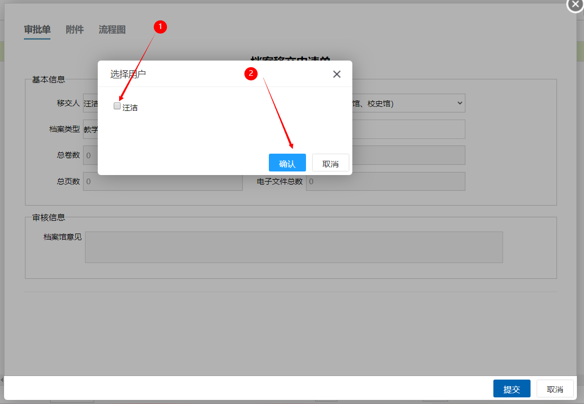 系统显示档案移交申请单基本信息(移交人、移交结构、档案类型、移交日期及移交总数、总页数),点击“提交”按钮后选择审批人审批