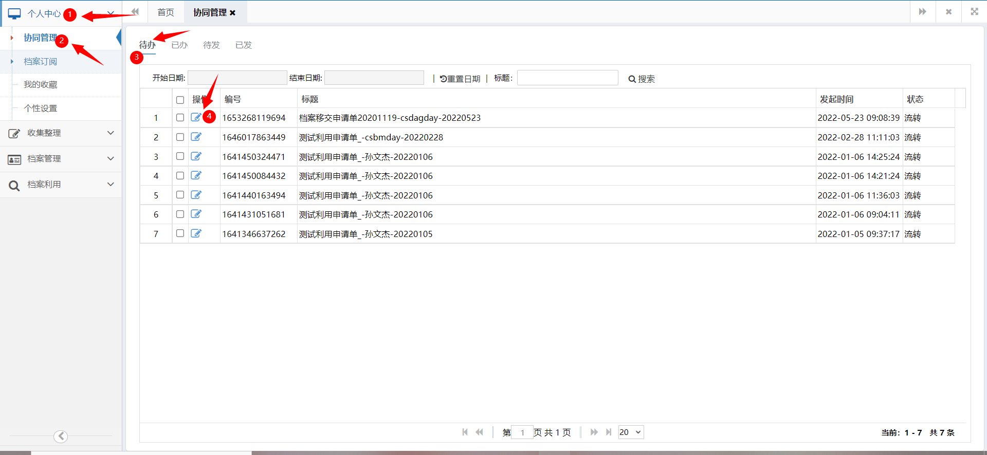 部门兼职档案员成功发起提交后,档案馆审核人员可以在个人中心—协同管理中查看发起的移交申请并审核。