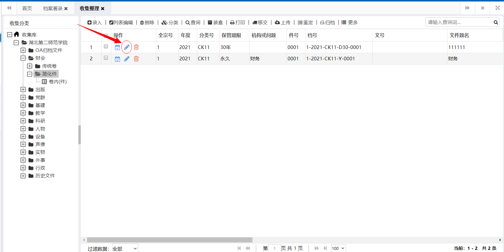 首先,进入需要挂接的门类,选择需要挂接的数据点击操作栏目下的小铅笔图案(注:案卷节点无法挂接需要进入卷内级挂接)