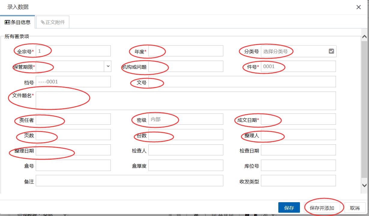 在档案管理系统中进行信息著录(具体操作流程详见附件2)。归档文件应逐件著录,一件一条目录;著录应当准确、详细,便于检索。著录的项目具体如下: