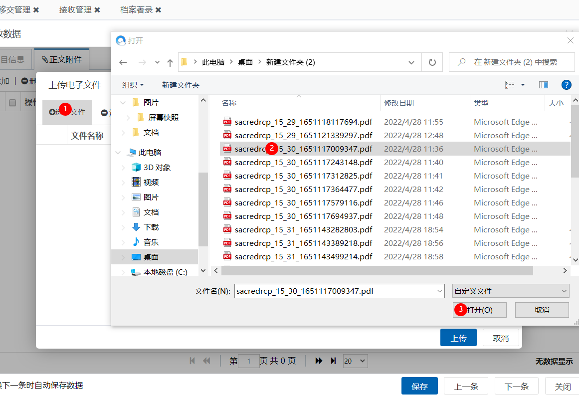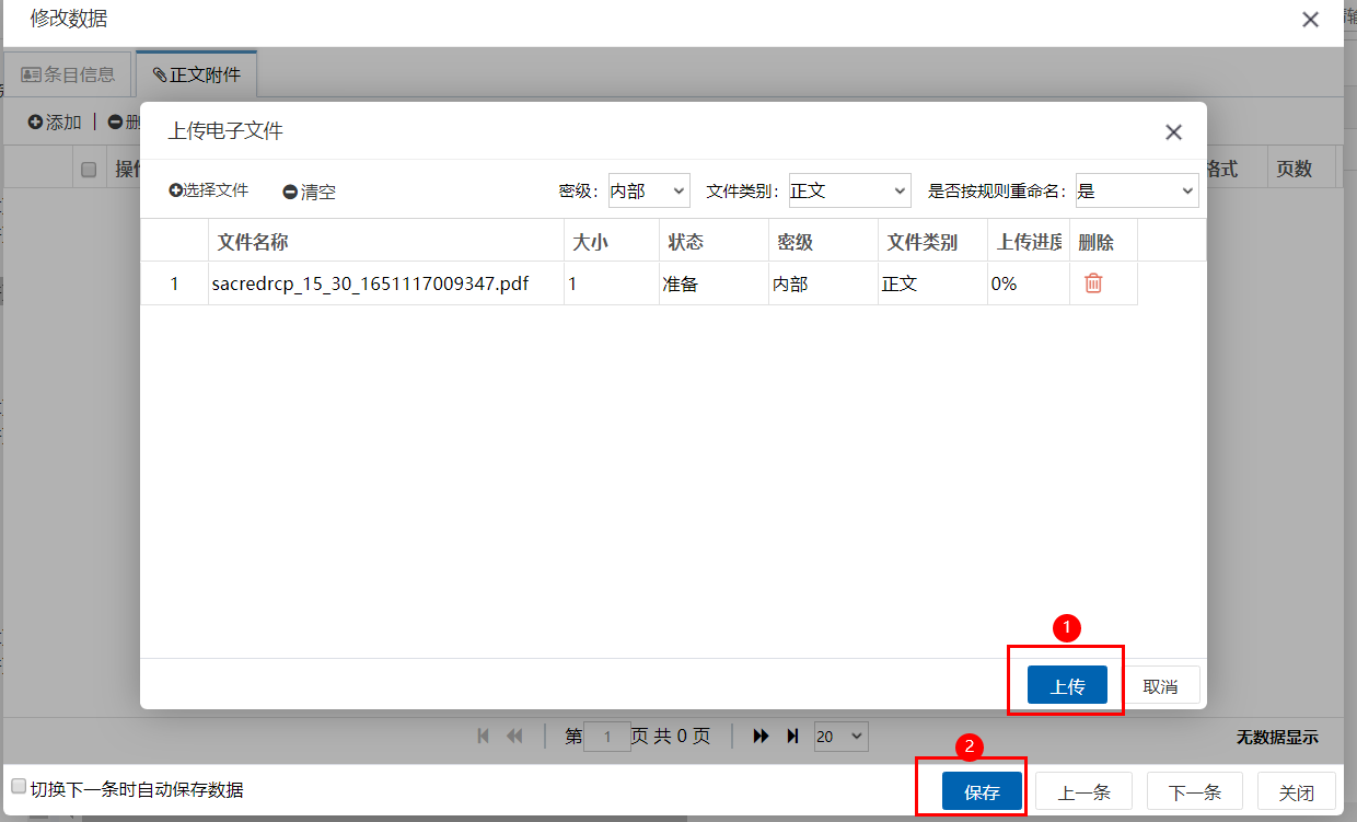 点击上传,重复上一步将该条目所有扫描文件都选上,然后点击上传,再点击保存完成文件上传挂接
